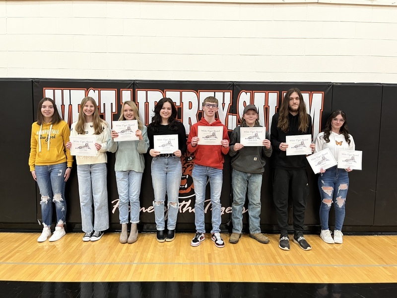 West Liberty-Salem High School held their annual White Tiger Award Ceremony on Friday, February 24th. The White Tiger Award is presented to students in grades 9-12 who work hard, have a great attitude, give from the heart, and are a positive role model for other students. Like a white tiger, these students are rare, and this ceremony is all about celebrating the unique impact they’ve had on the staff member who nominated them. This year a total of 23 students were honored by a teacher, counselor, or the Athletic Director. Each White Tiger recipient qualifies for a scholarship provided by the Angie Warye Family. In addition to recognition and scholarship potential, each student receives a certificate and letter written by the staff member by whom they were nominated. Congratulations to all of this year’s recipients!